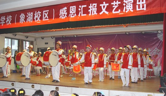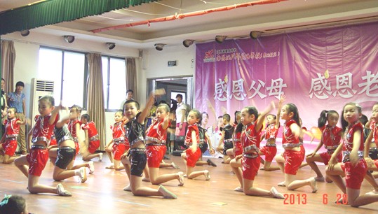 此次文藝演出圍繞“感恩”主題,頌揚了父母、老師及社會對孩子的培養(yǎng)之情,同學(xué)們以豐富多彩的文藝節(jié)目展現(xiàn)了校園生活,反映了他們的快樂和感恩之情。舞臺背景上醒目的標(biāo)識:“感恩父母、感恩老師、感恩社會”及2個敬禮的少先隊員的畫面,構(gòu)建了會場濃濃的感恩氛圍。開場時嘹亮的鼓號聲奏響了孩子們的前進(jìn)誓言,拉開了表演的序幕。隨后,精彩的節(jié)目一一登場,《大家一起來》、《印度天使》是小學(xué)一、二年級小朋友們帶來的節(jié)目,他們年紀(jì)雖小,但舞蹈水平不低,整齊劃一的動作、天真無邪的笑容,不禁讓人心生憐愛;《英語歌曲串燒》、《中華武術(shù)魂》、《戲曲聯(lián)唱》不僅給大家?guī)眢@喜,也從不同的側(cè)面反映出了校園文化生活的豐富多彩。令人忍俊不禁的是三(1)班的《江南style》,胖胖的“鳥叔”一上場,臺上臺下都響起了一片歡呼聲,將演出推向了高潮!